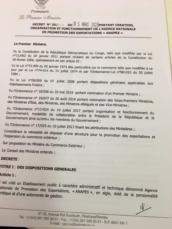 Le premier ministre de la République Démocratique du Congo Sylvestre Ilunga Ilunkamba a signé en date du 5 mars 2020, un décret portant création de l'Agence Nationale de Promotion des Exportations, (ANAPEX).