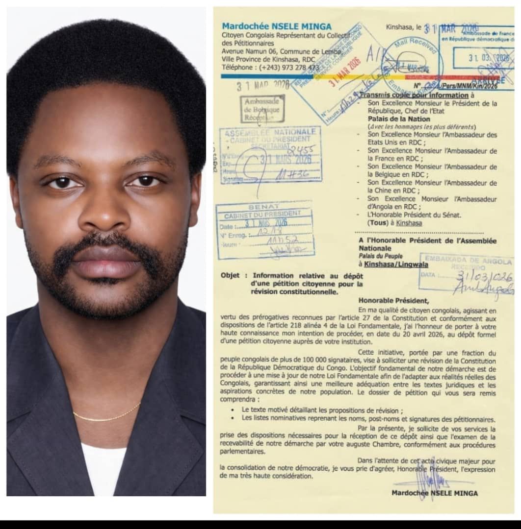 La pétition sur la révision constitutionnelle initiée depuis peu par Mardochée Nsele Minga, Président national de la jeunesse FIDEC de Fifi Masuka, a ete déposée à l'Assemblée nationale et à la Présidence de la République ainsi qu'aux ambassades de l'Angola et de la France, ce 31 mars 26.