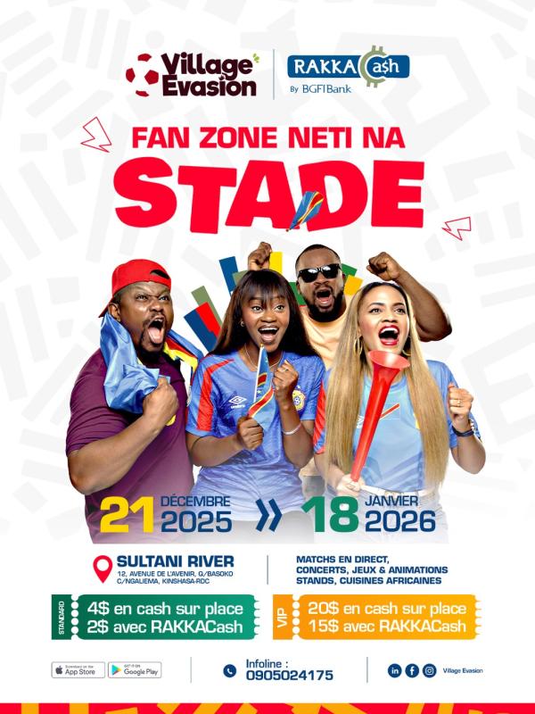 À l’occasion de la Coupe d’Afrique des Nations, RAKKACash by BGFIBank annonce le lancement du Village Évasion RAKKACash, une fan zone immersive dédiée au football africain et aux festivités de fin d’année, qui se tiendra du 21 décembre 2025 au 18 janvier 2026 à Kinshasa. Installé au Sultani River, situé au 12 avenue de l’Avenir dans le quartier Basoko, commune de Ngaliema, près de Kintambo Magasin, ce village se veut bien plus qu’un simple espace de retransmission des matchs de la CAN.