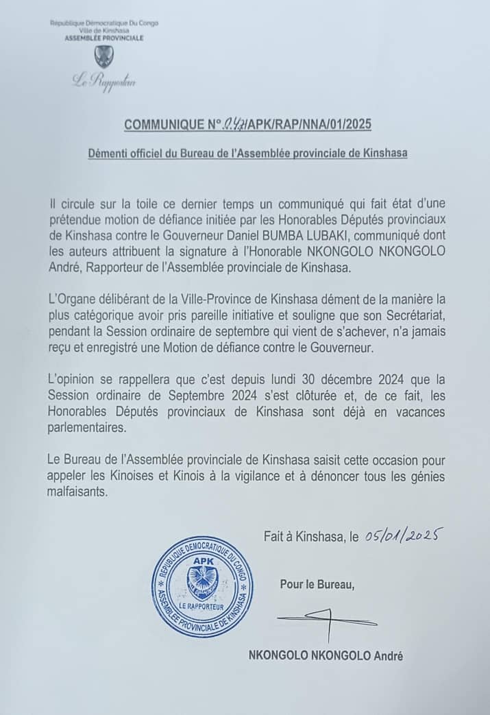 À travers un communiqué rendu public ce dimanche 5 janvier 2025, le bureau de l’Assemblée provinciale de Kinshasa a démenti les intox qui circulent sur la toile sur une prétendue motion de défiance contre le gouverneur de la ville, Daniel Bumba Lubaki.