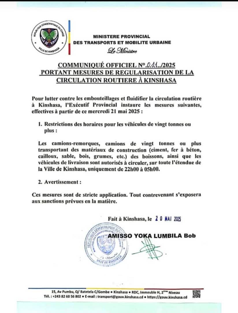 Il s’agit , selon un communiqué consulté par la Rédaction de 7SUR7.CD, des restrictions des horaires pour les véhicules de vingt tonnes ou plus.